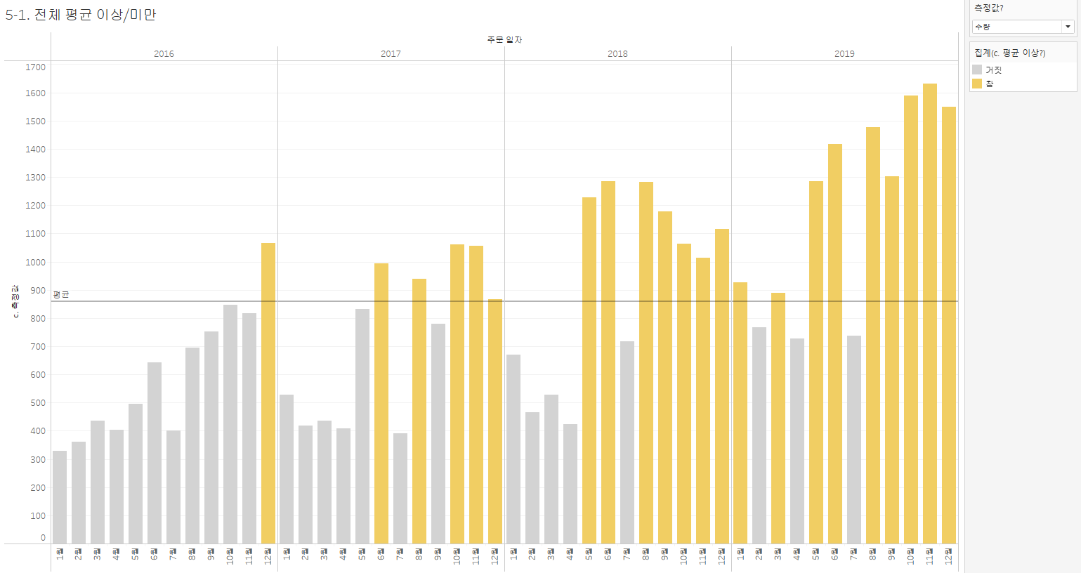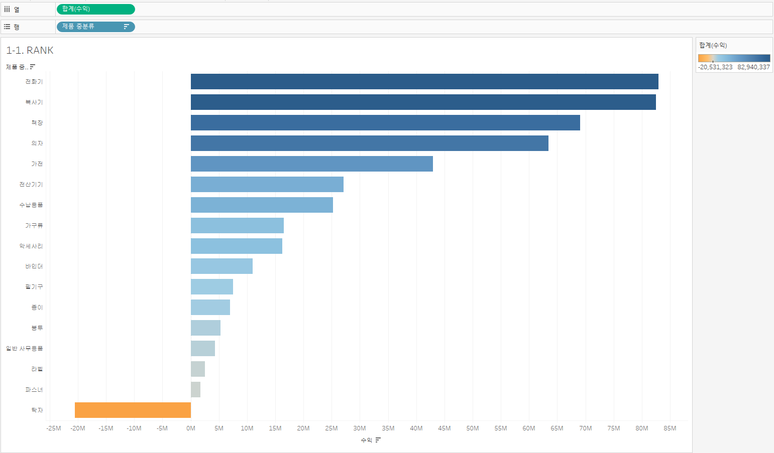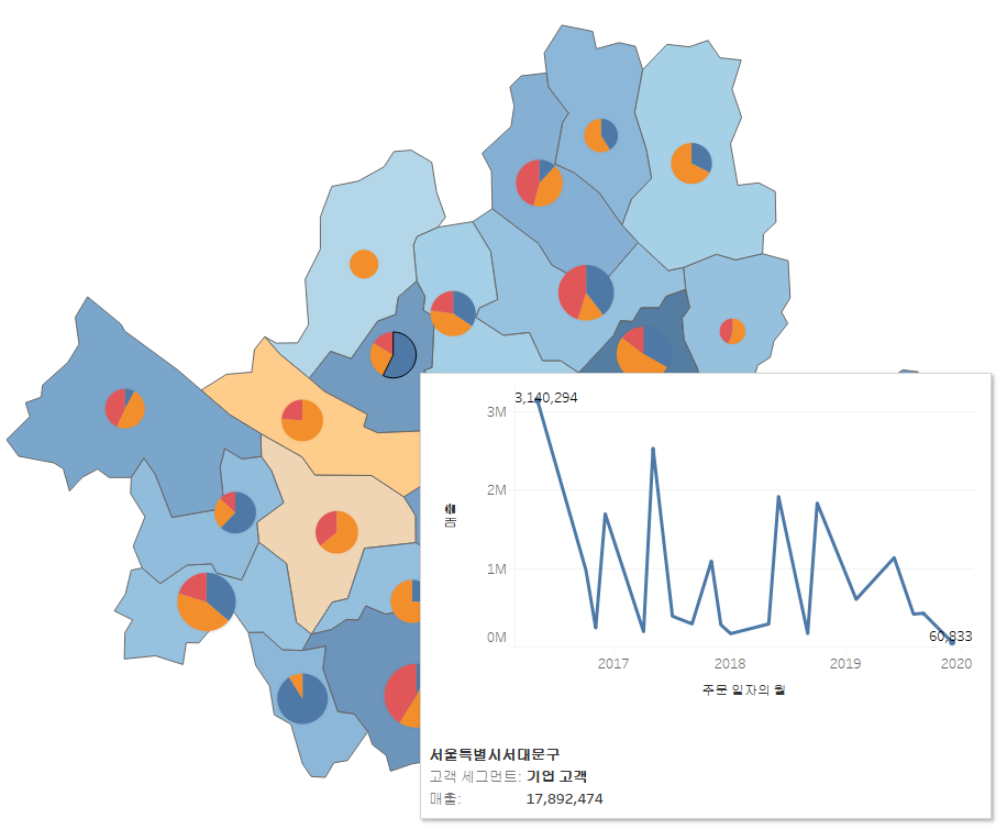 https://youtu.be/g8KAJr9I308 위 강의를 보고 실습하면서 정리한 내용입니다. ▶ DATEPART & DATETRUNC 함수 활용 [DATEPART - 날짜 형식을 정수로 바꿔주는 함수 (불연속형)] 날짜 형식을 선반에 올려놓으면 자동적으로(불연속형일 경우) DATEPART 함수가 사용된다. [DATETRUNC - 날짜 형식을 정수로 바꿔주는 함수 (연속형)] 날짜 형식을 선반에 올려놓으면 자동적으로(연속형일 경우) DATETRUNC 함수가 사용된다. 데이터의 형식은 연속형이지만, 보여주는 방식을 분절해서 보여주고 싶다면 '불연속형'으로 변환한다. [DATEPART 활용하기 - 요일 표시] 1) 차원에 있는 [주문 일자]를 마우스 오른쪽 버튼 클릭하고 행에 드래그하여 '주문 일자 (불..